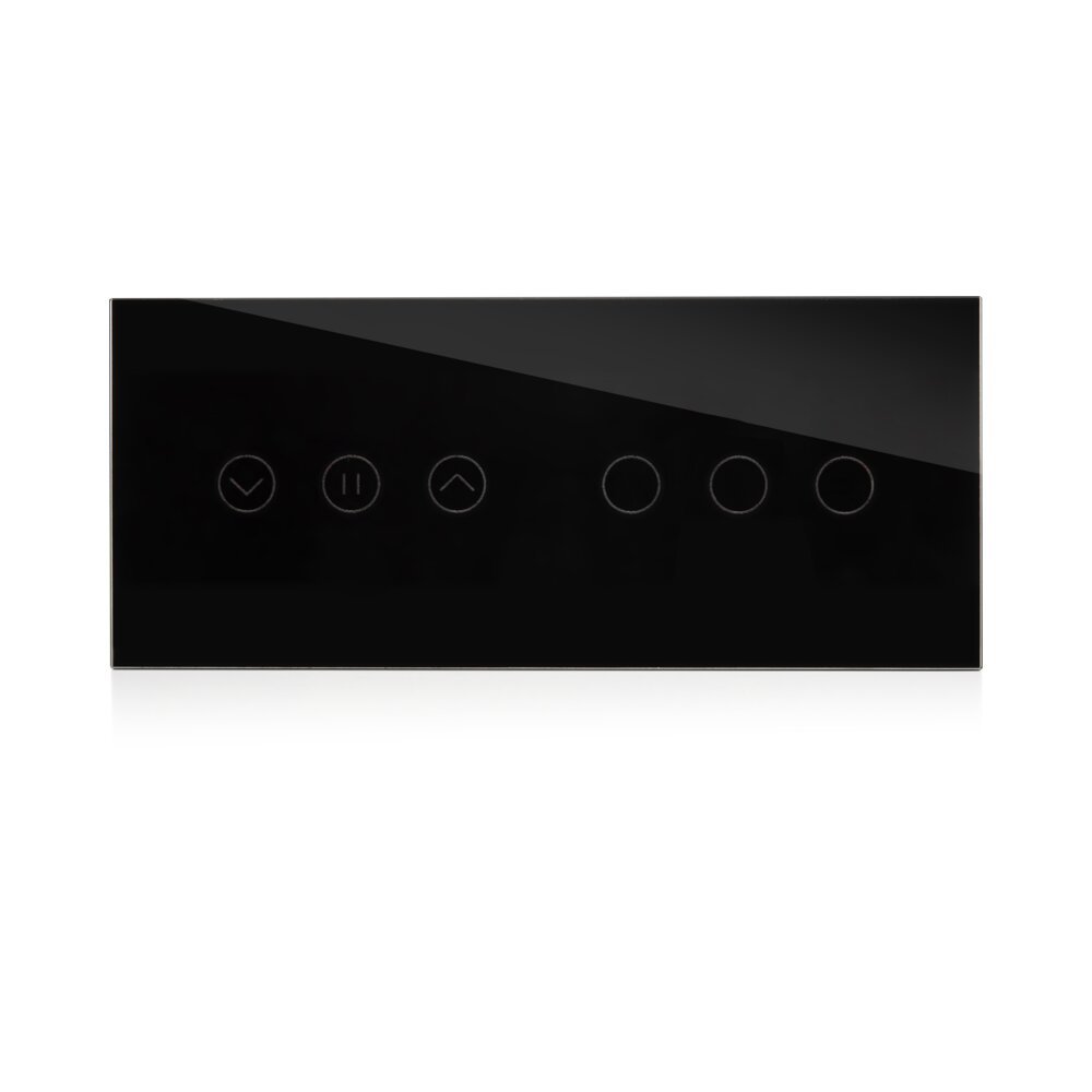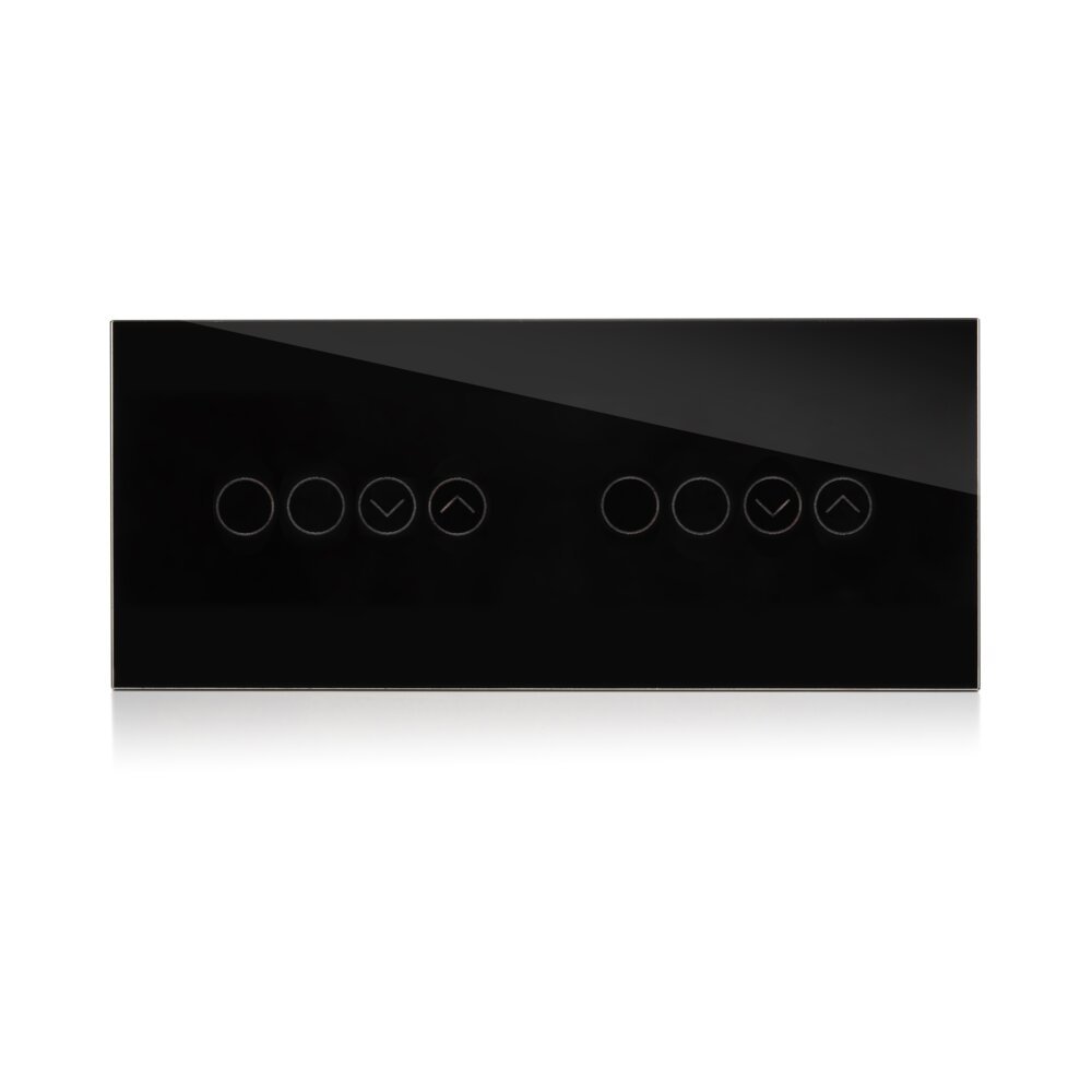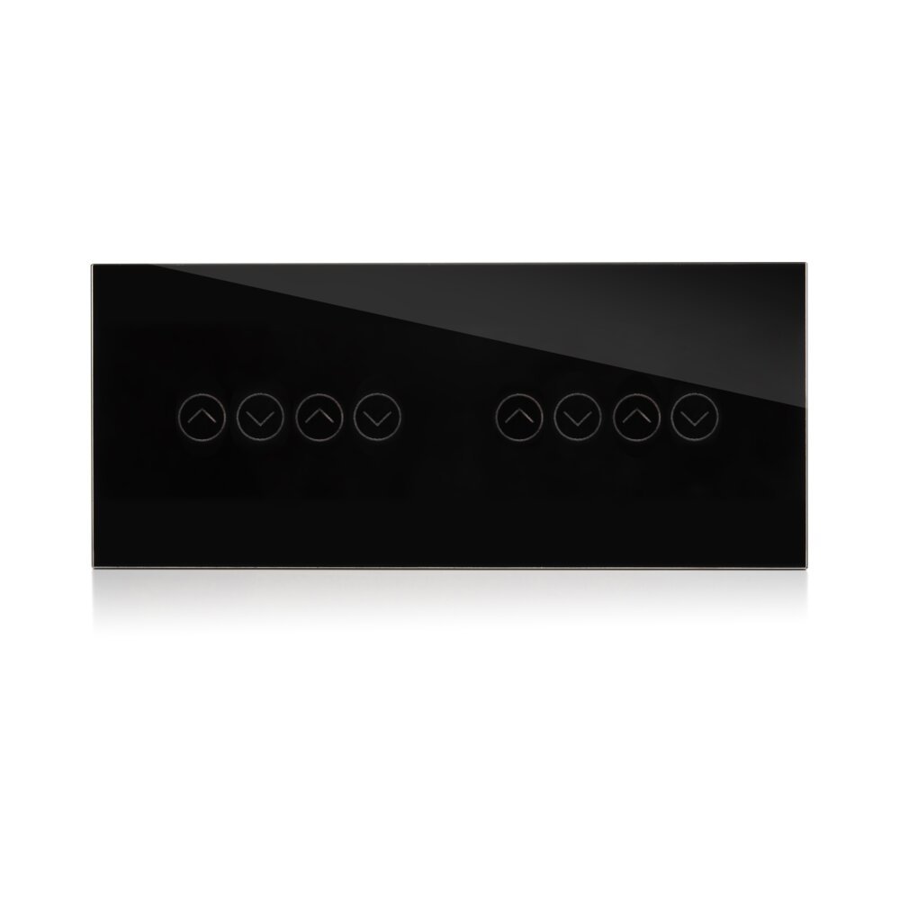 מתג חכם מסדרת SHUTTER של NISKO SMART, המיועד לשליטה חכמה ונוחה בתריסים חשמליים. מתאים להתקנה תחת הטיח במסגרות לקופסה מלבנית, ומשלב עיצוב יוקרתי עם זכוכית מחוסמת וגימור שחור אלגנטי